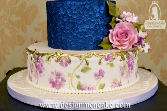 The theme as you can see represents the 17th – 18th century baroque style. Consisting of the dramatic exuberance of colors from today while bringing out the profound ornate elegance of the many fine detailed golden miniature flowers, swirls and pearls. The class will be separated into 2 part class for the 3 hours. Karen will teach the students on how to create the beautiful blend of colors on the cake, and I will teach how to accessorize the cake so it shines!